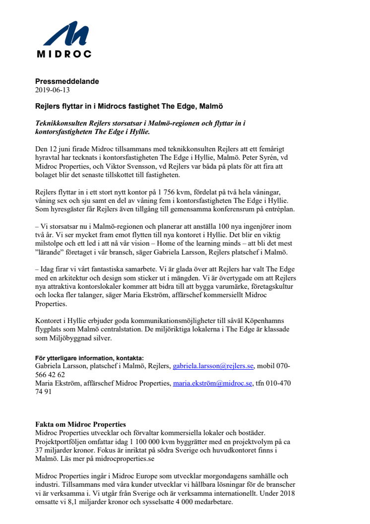Rejlers flyttar in i Midrocs fastighet The Edge, Malmö