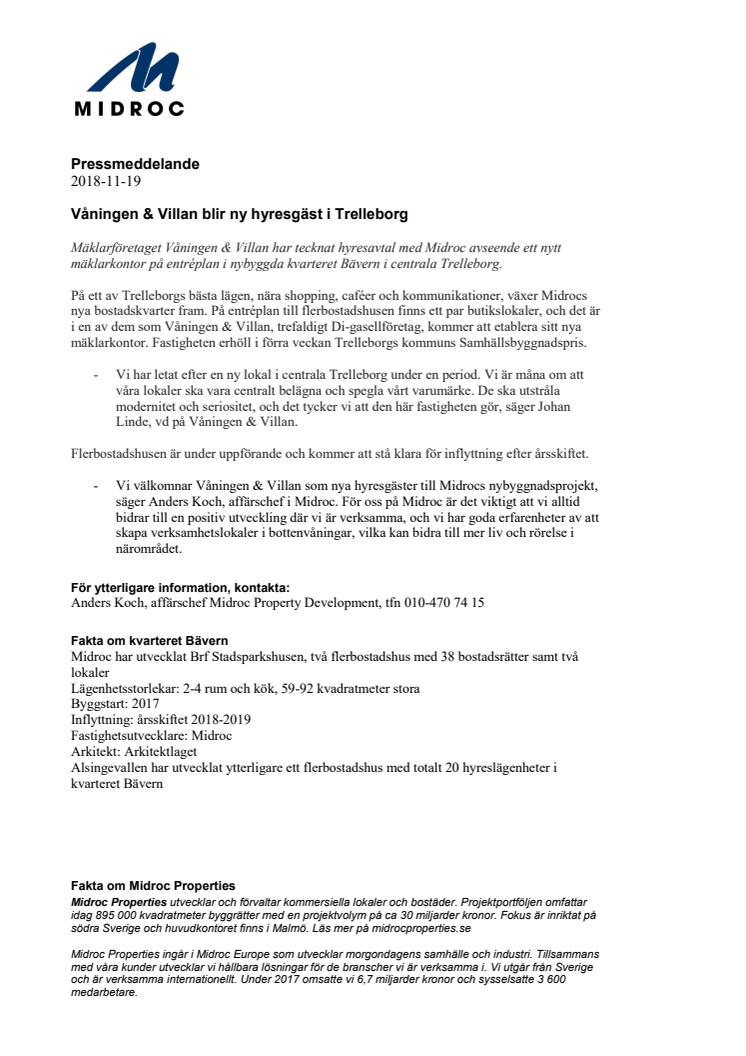 Mäklarföretaget Våningen & Villan har tecknat hyresavtal med Midroc avseende ett nytt mäklarkontor på entréplan i nybyggda kvarteret Bävern i centrala Trelleborg.