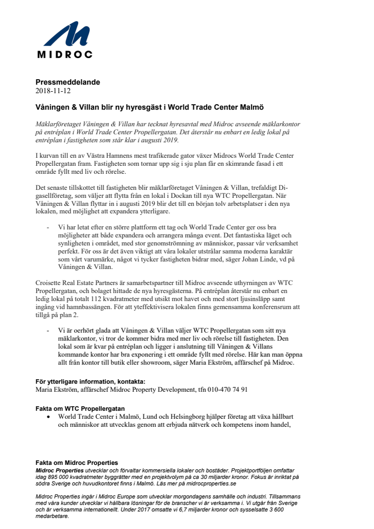 Mäklarföretaget Våningen & Villan har tecknat hyresavtal med Midroc avseende mäklarkontor på entréplan i World Trade Center Propellergatan. Det återstår nu enbart en ledig lokal på entréplan i fastigheten som står klar i augusti 2019.