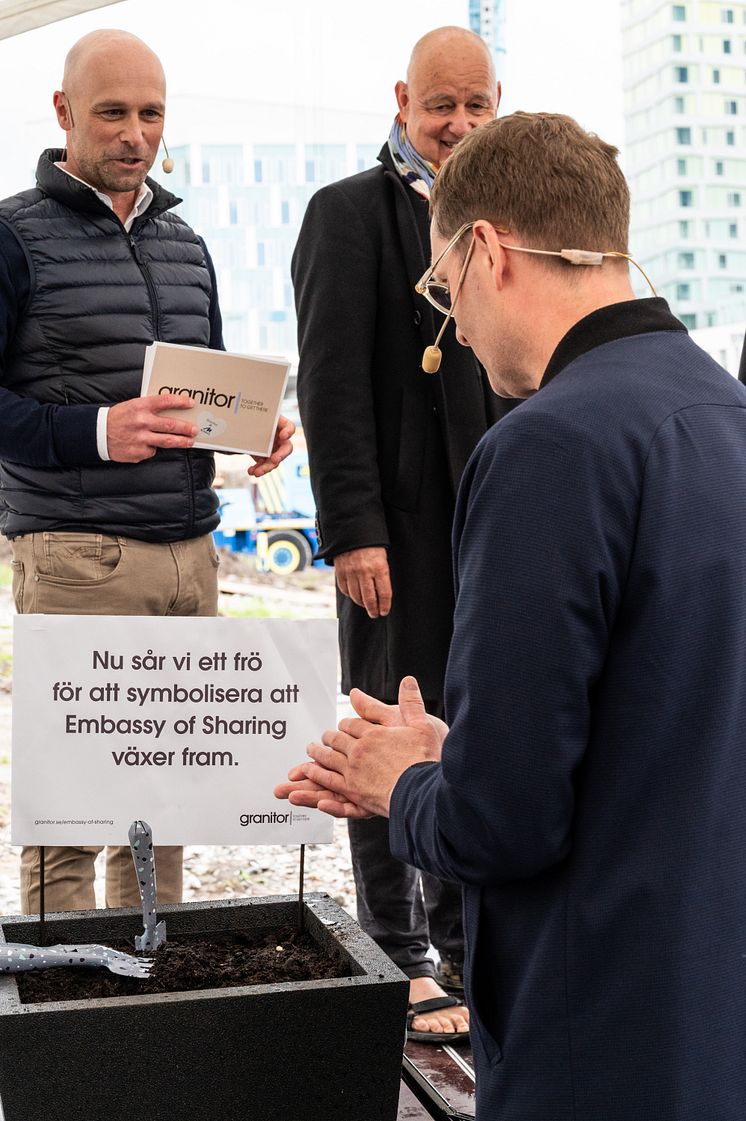 Peter Syrén, vd Granitor Properties, Gert Wingårdh, arkitekt Wingårdhs, Marcus Horning, stadsbyggnadsdirektör sår ett frö för att symbolisera att området Embassy of Sharing växer fram på ett byggstartsevent.