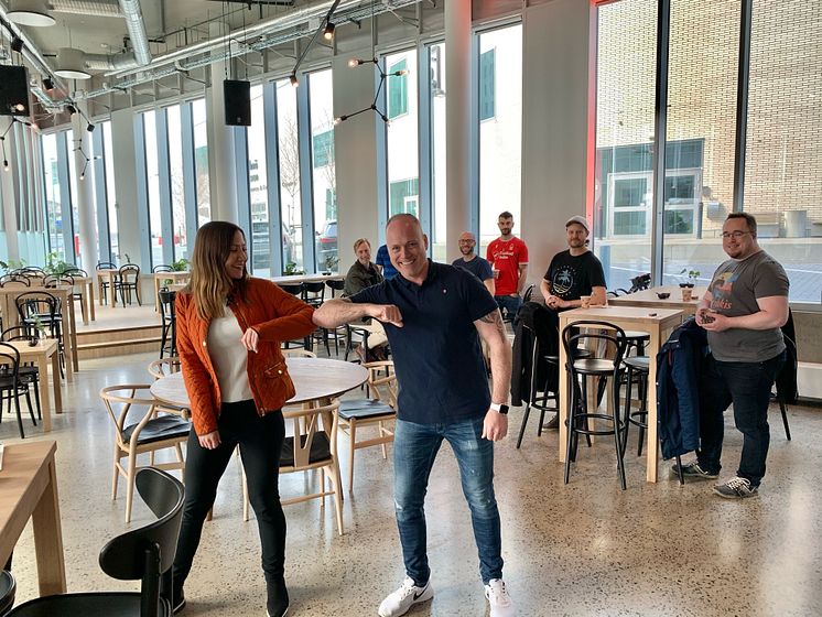 Uthyrningsansvarig Louise Carlsson tar i hand med blivande hyresgästen Christian Andersson på Barkfors Fleet