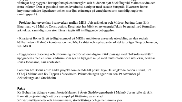 Förutom Kv Bohus är tre andra projekt nominerade till priset: Nya Helsingkrona nation i Lund, Brf O´hoj i Malmö och Kv Tappen i Stockholm. Prisutdelningen äger rum den 19 november på Arkitekturgalan i Stockholm.