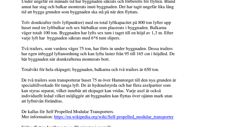 Flyttföretaget Nylundhs Special Entreprenad har arbetat intensivt med att förbereda den 118-åriga träbyggnaden för flytten. Byggnaden har lyfts upp med hjälp av tolv domkrafter till en höjd på 1,3 meter. Därefter har byggnaden sänkts ned på två 75 ton tunga trailers som kommer att transportera byggnaden 75 meter dit den ska placeras på en ny betonggrund. Själva flytten av den 400 ton tunga byggnaden beräknas till cirka 20 minuter.