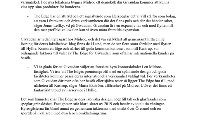 - Vi är glada för att Givaudan väljer att fortsätta hyra kontorslokaler i en Midroc-fastighet. Vi tror att The Edges premiumprofil med en spännande design och goda faciliteter kommer passa deras internationella verksamhet väldigt väl. För verksamheter som Givaudan där man ofta har besök eller själva reser så ligger The Edge bra till, med närheten till Kastrup, säger Maria Ekström, affärschef på Midroc. Utöver det finns ett fantastiskt utbud av närservice i Hyllie.