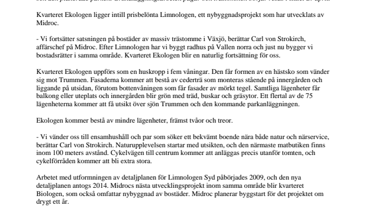 - Vi fortsätter satsningen på bostäder av massiv trästomme i Växjö, berättar Carl von Strokirch, affärschef på Midroc. Efter Limnologen har vi byggt radhus på Vallen norra och just nu bygger vi bostadsrätter i samma område. Kvarteret Ekologen blir en naturlig fortsättning för oss.