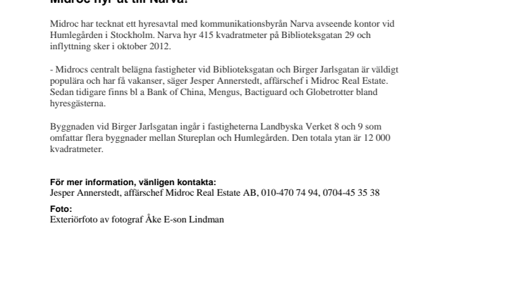 Midroc har tecknat ett hyresavtal med kommunikationsbyrån Narva avseende kontor vid Humlegården i Stockholm. Narva hyr 415 kvadratmeter på Biblioteksgatan 29 och inflyttning sker i oktober 2012.