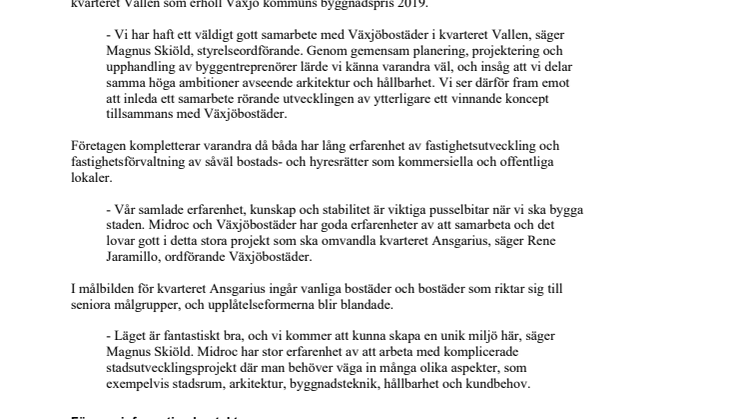 – Vår samlade erfarenhet, kunskap och stabilitet är viktiga pusselbitar när vi ska bygga staden. Midroc och Växjöbostäder har goda erfarenheter av att samarbeta och det lovar gott i detta stora projekt som ska omvandla kvarteret Ansgarius, säger Rene Jaramillo, ordförande Växjöbostäder.