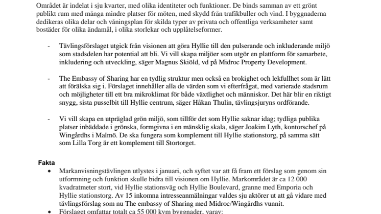 -The Embassy of Sharing har en tydlig struktur men också en brokighet och lekfullhet som är lätt att förälska sig i. Förslaget innehåller alla de värden som vi efterfrågat, med varierade stadsrum och möjligheter till ett bra mikroklimat för både växtlighet och människor. Det här blir en riktigt snygg, sista pusselbit till Hyllie centrum, säger Håkan Thulin, tävlingsjuryns ordförande.