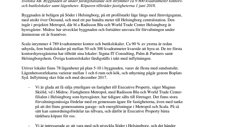 -Vi är glada att få sälja ytterligare en fastighet till Executive Property, säger Magnus Skiöld, vd i Midroc. Fastigheten Metropol, med Radisson Blu och World Trade Center-filialen i Helsingborg som hyresgäster, har tidigare sålts till företaget. Det finns stora förvaltningsmässiga fördelar med en gemensam ägare till fastigheterna, även med tanke på att det finns gemensamma garage- och energilösningar i Metropol och Scala. På så sätt kan samordningsfördelar tas tillvara, och därför är Executive Property bästa tänkbara köpare för oss.