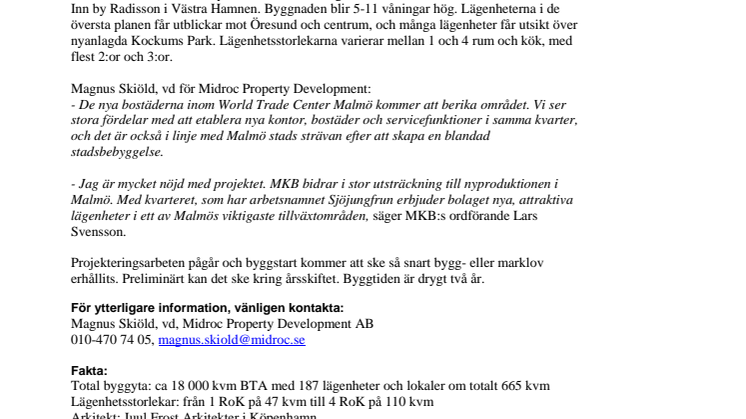 - De nya bostäderna inom World Trade Center Malmö kommer att berika området. Vi ser stora fördelar med att etablera nya kontor, bostäder och servicefunktioner i samma kvarter, och det är också i linje med Malmö stads strävan efter att skapa en blandad stadsbebyggelse.