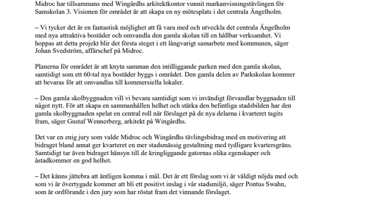 Midroc har tillsammans med Wingårdhs arkitektkontor vunnit markanvisningstävlingen för Samskolan 3. Visionen för området är att skapa en ny mötesplats i det centrala Ängelholm.