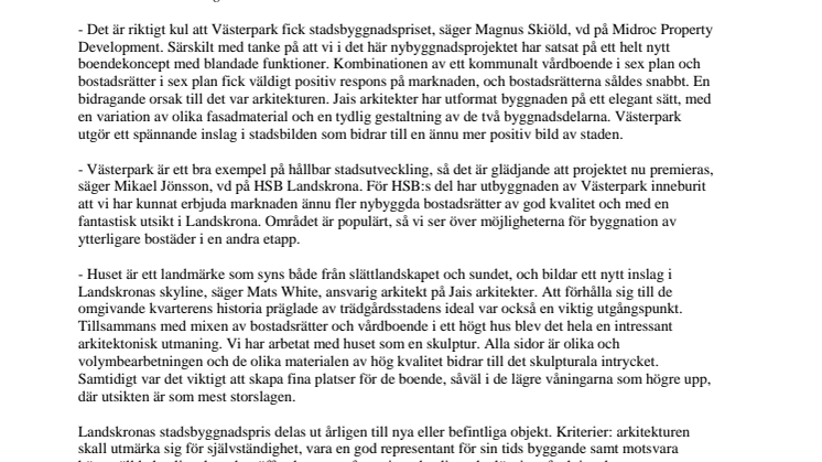- Västerpark är ett bra exempel på hållbar stadsutveckling, så det är glädjande att projektet nu premieras, säger Mikael Jönsson, vd på HSB Landskrona. För HSB:s del har utbyggnaden av Västerpark inneburit att vi har kunnat erbjuda marknaden ännu fler nybyggda bostadsrätter av god kvalitet och med en fantastisk utsikt i Landskrona. Området är populärt, så vi ser över möjligheterna för byggnation av ytterligare bostäder i en andra etapp.