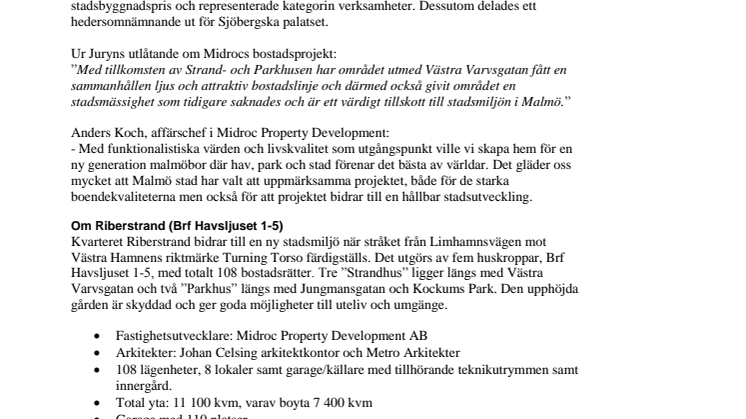 De 108 nybyggda bostadsrätterna Riberstrand (Brf Havsljuset) i Västra Hamnen belönades under Stadsbyggandets dag i Malmö som klassvinnare i kategorin bostäder. Priset delas årligen ut av Malmö stad.