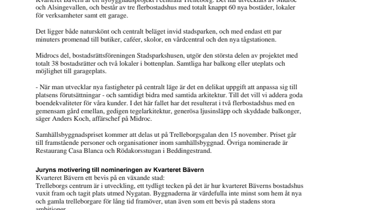 Midrocs och Alsingevallens gemensamma bostadsprojekt, kvarteret Bävern i Trelleborg, har nominerats till stadens Samhällsbyggnadspris 2018.