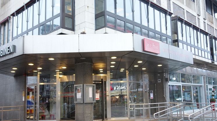Bildtext: Hybrix är monterat som fasadmaterial med yta av rostfritt material på hotell Scandic Rubinen, Kungsportsavenyen, Göteborg. En studie gjord på Chalmers Tekniska Högskola visar att denna sandwich ger mindre miljöpåverkan än motsvarande fasadbeklädnad med solid metall.