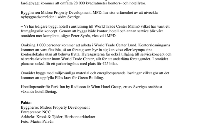 Ett modernt kontors- och hotellområde växer fram vid Lunds nya infart från E22:an, World Trade Center Lund. Först ut i området är Hotell Park Inn by Radisson som med sina 192 rum blir näst störst i Lund. På lördag den 1 mars slås portarna upp för de första gästerna.