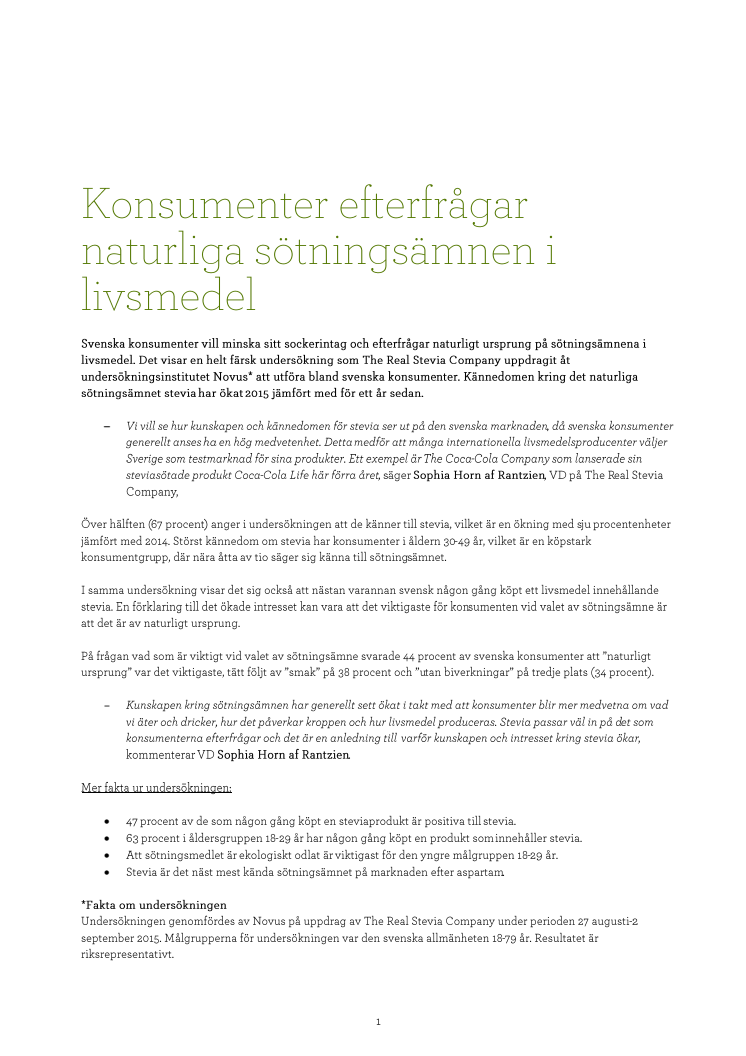 Svenska konsumenter vill minska sitt sockerintag och efterfrågar naturligt ursprung på sötningsämnena i livsmedel. Det visar en helt färsk undersökning som The Real Stevia Company uppdragit åt undersökningsinstitutet Novus* att utföra bland svenska konsumenter. Kännedomen kring det naturliga sötningsämnet stevia har ökat 2015 jämfört med för ett år sedan.