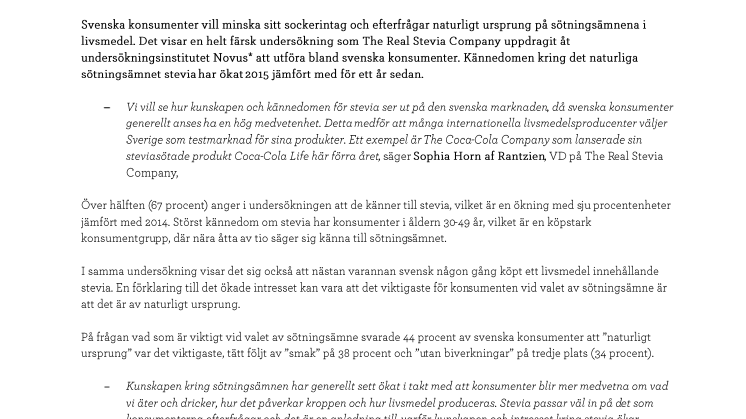 Svenska konsumenter vill minska sitt sockerintag och efterfrågar naturligt ursprung på sötningsämnena i livsmedel. Det visar en helt färsk undersökning som The Real Stevia Company uppdragit åt undersökningsinstitutet Novus* att utföra bland svenska konsumenter. Kännedomen kring det naturliga sötningsämnet stevia har ökat 2015 jämfört med för ett år sedan.