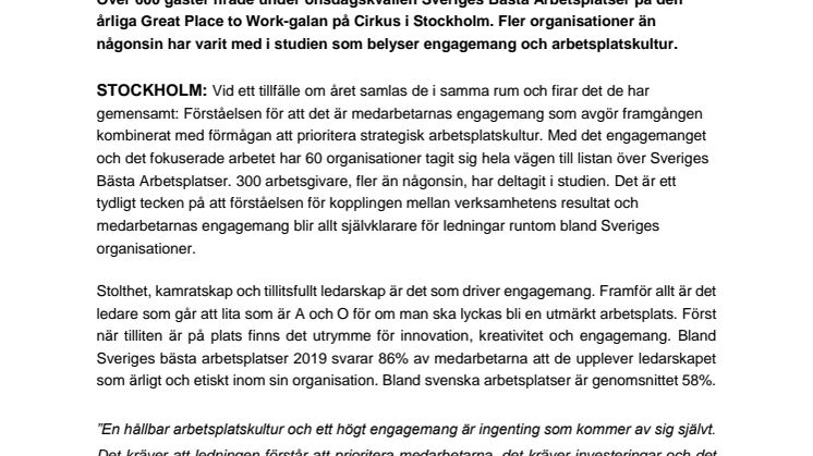 STOCKHOLM: Vid ett tillfälle om året samlas de i samma rum och firar det de har gemensamt: Förståelsen för att det är medarbetarnas engagemang som avgör framgången kombinerat med förmågan att prioritera strategisk arbetsplatskultur. Med det engagemanget och det fokuserade arbetet har 60 organisationer tagit sig hela vägen till listan över Sveriges Bästa Arbetsplatser. 300 arbetsgivare, fler än någonsin, har deltagit i studien. Det är ett tydligt tecken på att förståelsen för kopplingen mellan verksamhetens resultat och medarbetarnas engagemang blir allt självklarare för ledningar runtom bland Sveriges organisationer.