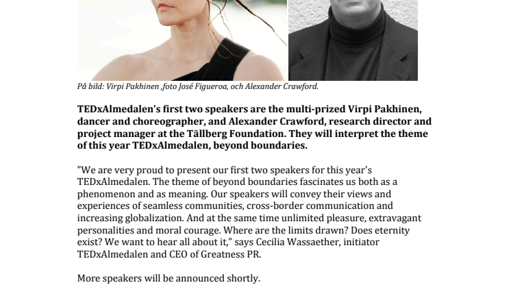 TEDxAlmedalens första två talare är den flerfaldigt prisade Virpi Pakhinen, dansare och koreograf och Alexander Crawford, research director och projektledare på Tällberg Foundation. De kommer att tolka temat för årets TEDxAlmedalen, gränslöshet.