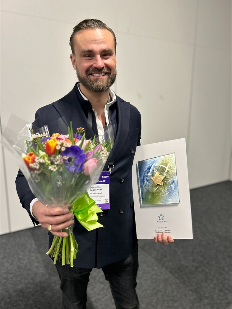 Picadelis och Greenfoods vd, David von Laskowski prisas för sitt inspirerande ledarskap. Under gårdagskvällen tog David emot den prestigefulla utmärkelsen Årets storbolags-vd 2023 på en ceremoni i Kistamässan. Utmärkelsen är instiftad för att främja ett långsiktigt hållbart näringsliv.