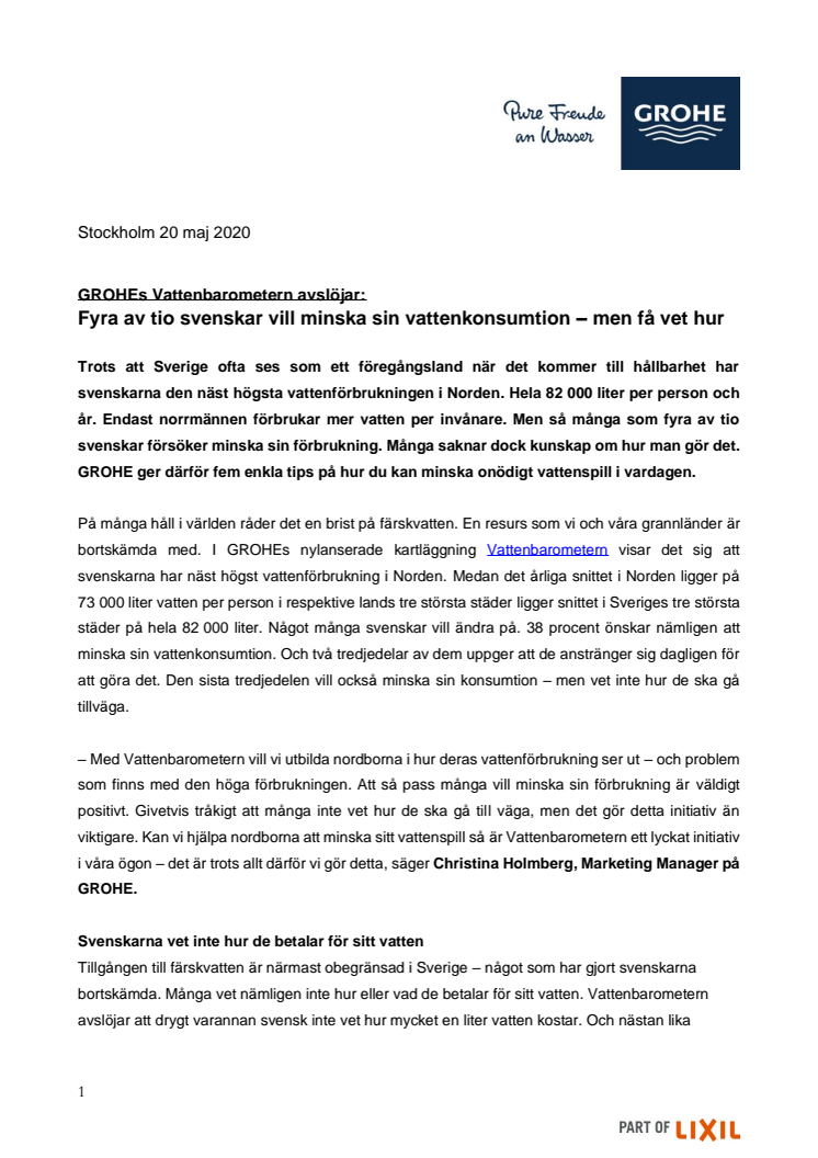 Trots att Sverige ses som ett föregångsland när det kommer till hållbarhet har svenskarna den näst högsta vattenförbrukningen i Norden. Hela 82 000 liter per person och år. Endast norrmännen förbrukar mer vatten. Men så många som fyra av tio svenskar försöker minska sin förbrukning. Många saknar dock kunskap om hur. GROHE ger därför fem enkla tips på hur du kan minska onödigt vattenspill.