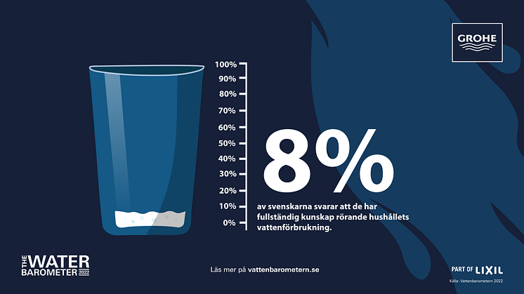 Samtidigt visar undersökningen att det fortsatt finns en bristande kunskap kring hur mycket vatten som ens hushåll faktiskt förbrukar varje månad. Färre än var tionde svensk (åtta procent) svarar att de har fullständig kunskap rörande hushållets förbrukning och två av fem svenskar (44 procent) anger att de vill lära sig mer om hur man minskar sin vattenförbrukning.