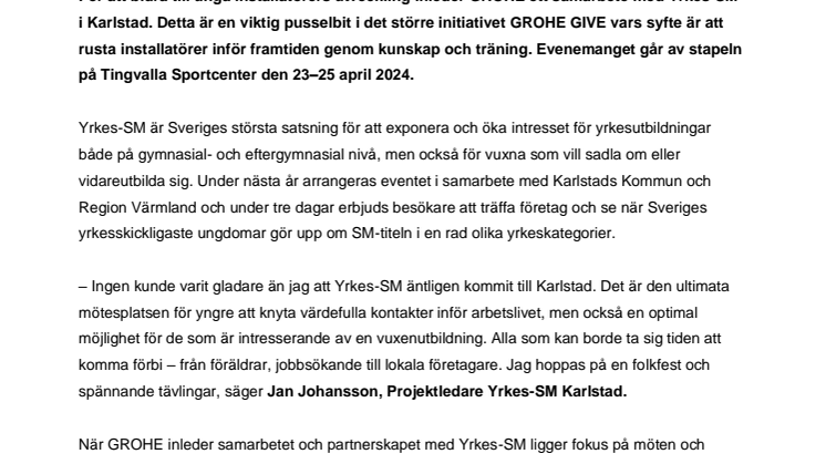 För att bidra till unga installatörers utveckling inleder GROHE ett samarbete med Yrkes-SM i Karlstad. Detta är en viktig pusselbit i det större initiativet GROHE GIVE vars syfte är att rusta installatörer inför framtiden genom kunskap och träning. Evenemanget går av stapeln på Tingvalla Sportcenter den 23–25 april 2024.