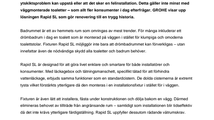 Att renovera badrum kan innebära många orosmoment. Från att rör skadas, till att ytskiktsproblem kan uppstå eller att det sker en felinstallation. Detta gäller inte minst med väggmonterade toaletter – som allt fler konsumenter i dag efterfrågar. GROHE visar upp lösningen Rapid SL som gör renovering till en trygg historia.