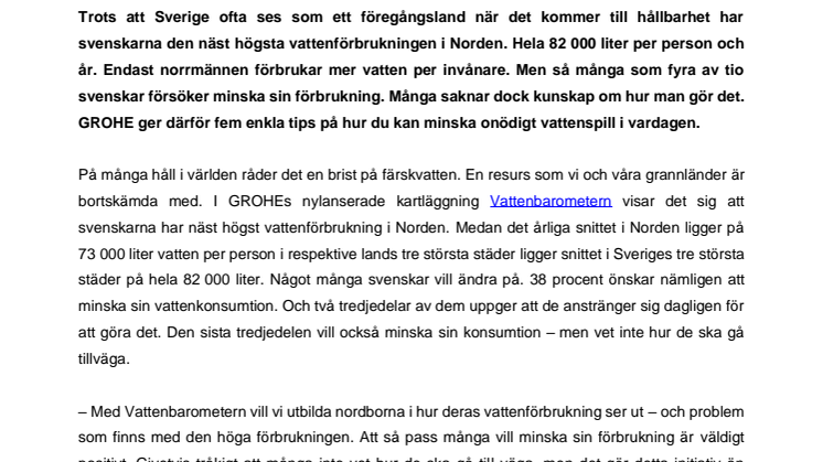 Trots att Sverige ofta ses som ett föregångsland när det kommer till hållbarhet har svenskarna den näst högsta vattenförbrukningen i Norden. Hela 82 000 liter per person och år. Endast norrmännen förbrukar mer vatten per invånare. Men så många som fyra av tio svenskar försöker minska sin förbrukning. Många saknar dock kunskap om hur man gör det. GROHE ger därför fem enkla tips på hur du kan minska onödigt vattenspill i vardagen.