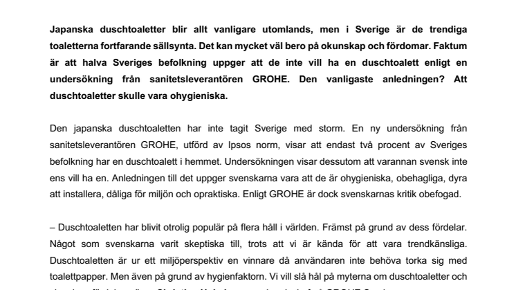 Den japanska duschtoaletten har inte tagit Sverige med storm. En ny undersökning från sanitetsleverantören GROHE, utförd av Ipsos norm, visar att endast två procent av Sveriges befolkning har en duschtoalett i hemmet. Undersökningen visar dessutom att varannan svensk inte ens vill ha en. Anledningen till det uppger svenskarna vara att de är ohygieniska, obehagliga, dyra att installera, dåliga för miljön och opraktiska. Enligt GROHE är dock svenskarnas kritik obefogad.
