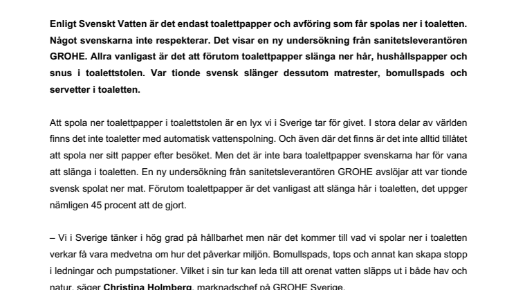 Enligt Svenskt Vatten är det endast toalettpapper och avföring som får spolas ner i toaletten. Något svenskarna inte respekterar. Det visar en ny undersökning från sanitetsleverantören GROHE. Allra vanligast är det att förutom toalettpapper slänga ner hår, hushållspapper och snus i toalettstolen. Var tionde svensk slänger dessutom matrester, bomullspads och servetter i toaletten.