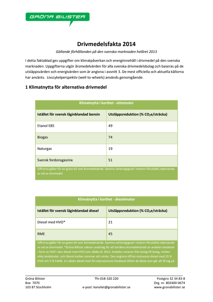Gröna Bilister årliga rapport som sammanställer klimatpåverkan hos de drivmedel som säljs i Sverige. Utsläppen från de förnybara drivmedlen är mycket lägre än från bensin och diesel. El från sol, vind eller vatten ger inga utsläpp alls, men om vi inte aktivt väljer miljömärkt el blir utsläppen ungefär desamma som då vi kör på etanol.