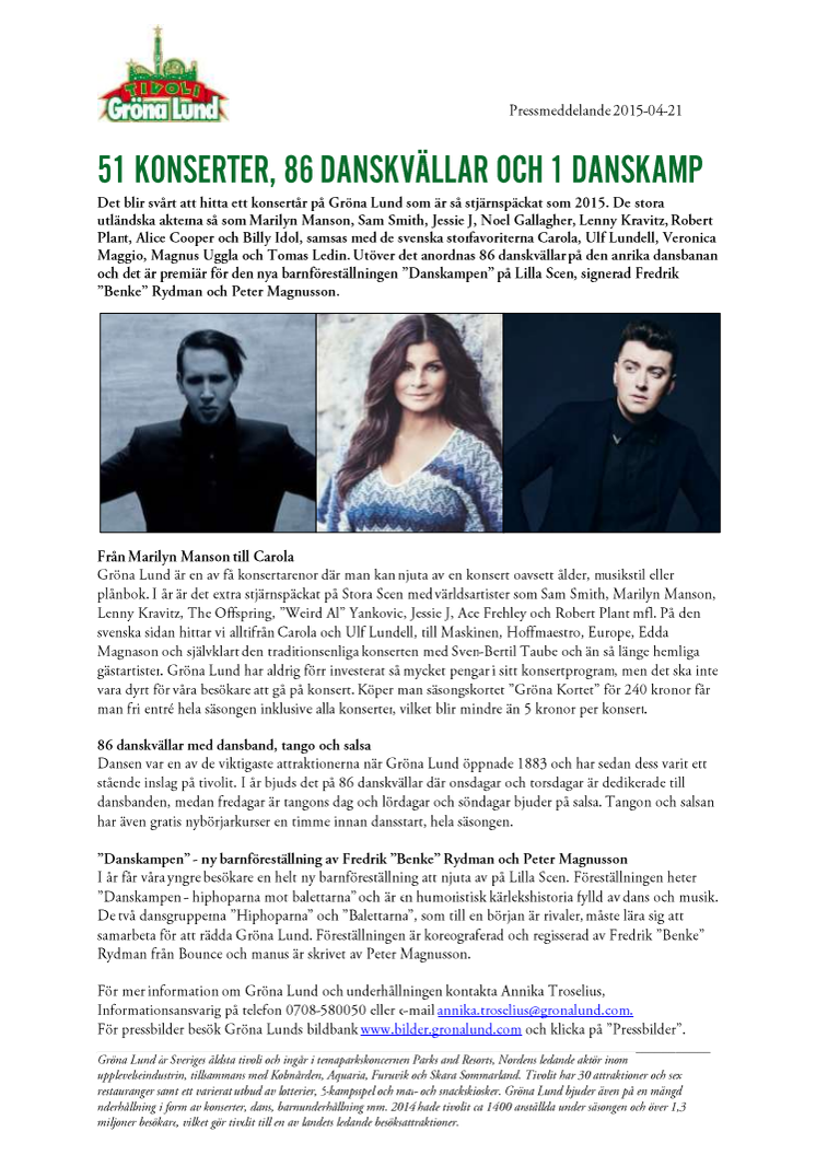 Det blir ett stjärnspäckat konsertår på Gröna Lund 2015. Marilyn Manson, Sam Smith, Jessie J, Noel Gallagher, Lenny Kravitz, Alice Cooper och Billy Idol, samsas med svenska storfavoriter som Carola, Ulf Lundell, Veronica Maggio, Magnus Uggla och Tomas Ledin. Utöver det anordnas 86 danskvällar på den anrika dansbanan och det är premiär för den nya barnföreställningen ”Danskampen” på Lilla Scen.