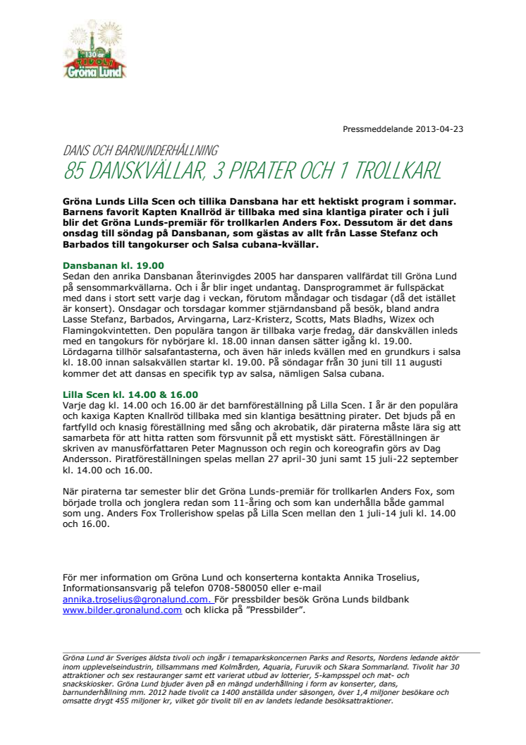 Gröna Lunds Lilla Scen och tillika Dansbana har ett hektiskt program i sommar. Barnens favorit Kapten Knallröd är tillbaka med sina klantiga pirater och i juli blir det Gröna Lunds-premiär för trollkarlen Anders Fox. Dessutom är det dans onsdag till söndag på Dansbanan, som gästas av allt från Lasse Stefanz och Barbados till tangokurser och Salsa cubana-kvällar.