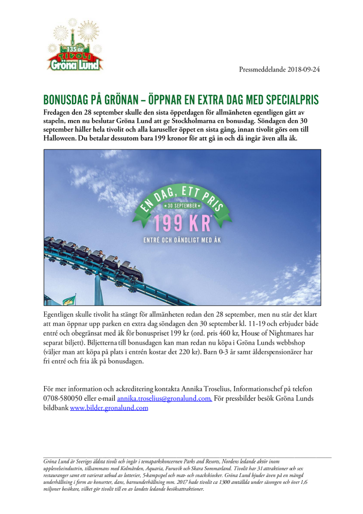 Fredagen den 28 september skulle den sista öppetdagen för allmänheten egentligen gått av stapeln, men nu beslutar Gröna Lund att ge Stockholmarna en bonusdag. Söndagen den 30 september håller hela tivolit och alla karuseller öppet en sista gång, innan tivolit görs om till Halloween. Du betalar dessutom bara 199 kronor för att gå in och då ingår även alla åk.