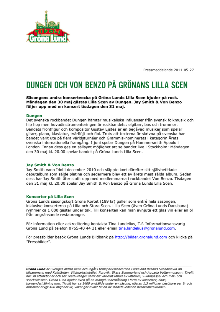 Säsongens andra konsertvecka på Gröna Lunds Lilla Scen bjuder på rock. Måndagen den 30 maj gästas Lilla Scen av Dungen. Jay Smith & Von Benzo följer upp med en konsert tisdagen den 31 maj.