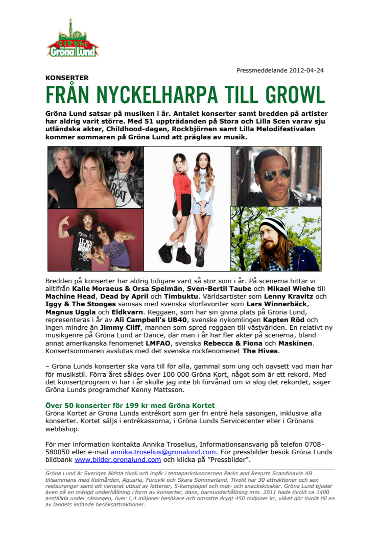 Gröna Lund satsar på musiken i år. Antalet konserter samt bredden på artister har aldrig varit större. Med 51 uppträdanden på Stora och Lilla Scen varav sju utländska akter, Childhood-dagen, Rockbjörnen samt Lilla Melodifestivalen kommer sommaren på Gröna Lund att präglas av musik.