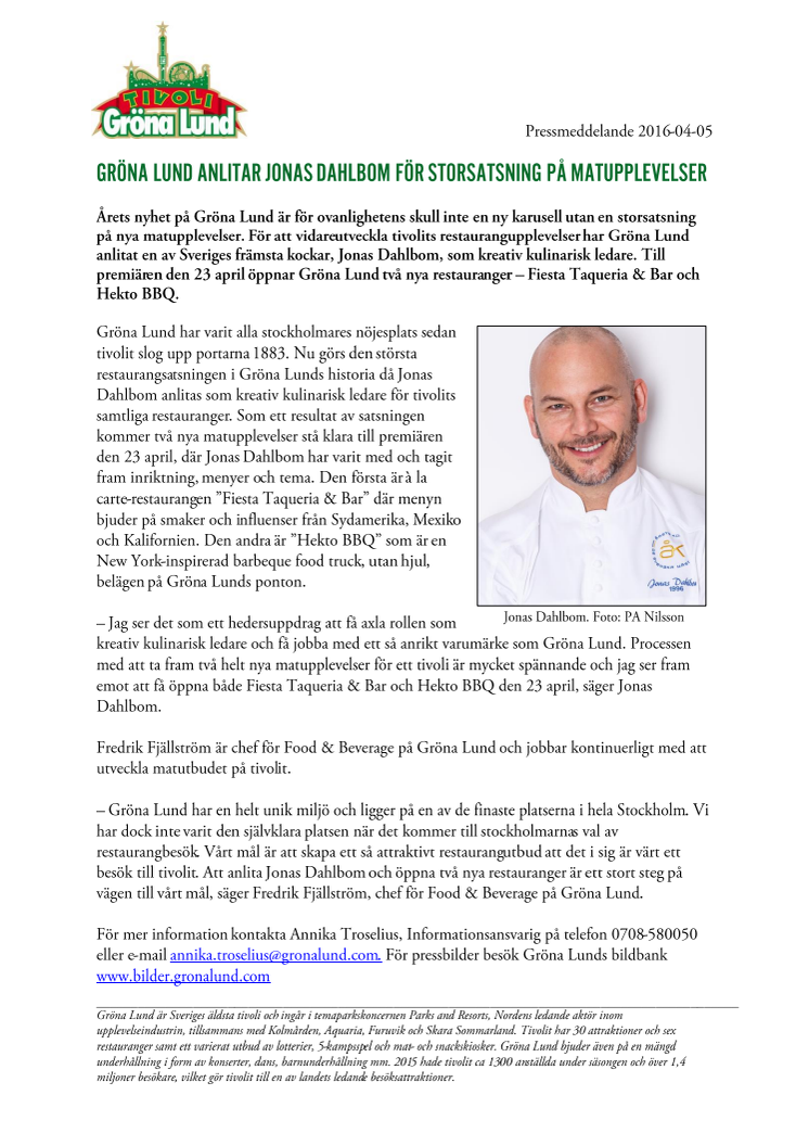 Årets nyhet på Gröna Lund är för ovanlighetens skull inte en ny karusell utan en storsatsning på nya matupplevelser. För att vidareutveckla tivolits restaurangupplevelser har Gröna Lund anlitat en av Sveriges främsta kockar, Jonas Dahlbom, som kreativ kulinarisk ledare. Till premiären den 23 april öppnar Gröna Lund två nya restauranger – Fiesta Taqueria & Bar och Hekto BBQ.