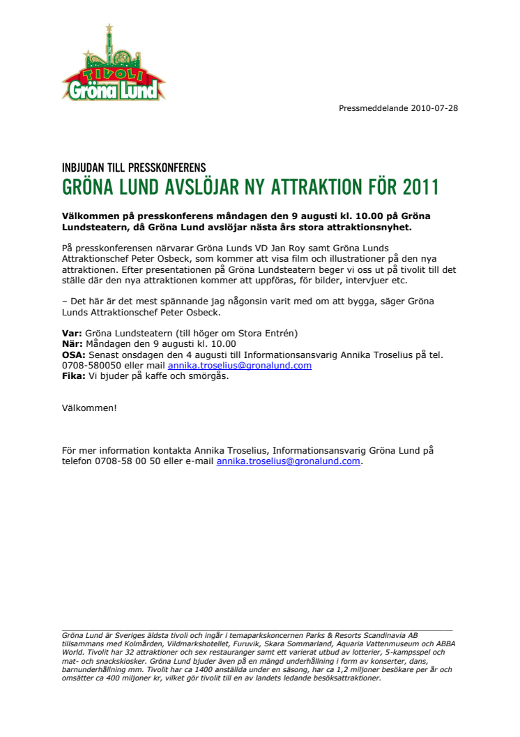 Välkommen på presskonferens måndagen den 9 augusti kl. 10.00 på Gröna Lundsteatern, då Gröna Lund avslöjar nästa års stora attraktionsnyhet.