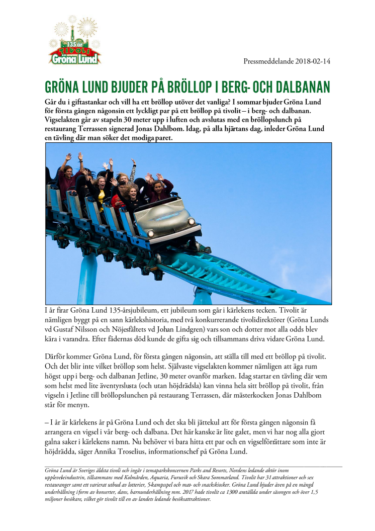 Går du i giftastankar och vill ha ett bröllop utöver det vanliga? I sommar bjuder Gröna Lund för första gången någonsin ett lyckligt par på ett bröllop på tivolit – i berg- och dalbanan. Vigselakten går av stapeln 30 meter upp i luften och avslutas med en bröllopslunch på restaurang Terrassen signerad Jonas Dahlbom. Idag inleder Gröna Lund en tävling där man söker det modiga paret.
