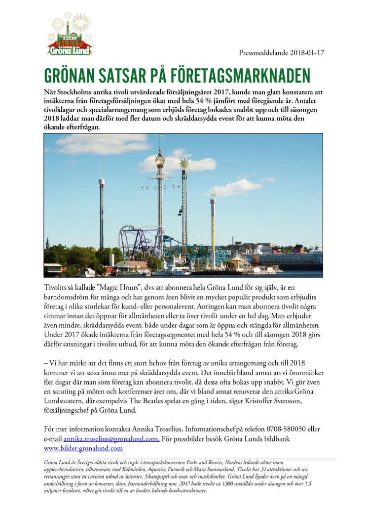 När Stockholms anrika tivoli utvärderade försäljningsåret 2017, kunde man glatt konstatera att intäkterna från företagsförsäljningen ökat med hela 54 % jämfört med föregående år. Antalet tivolidagar och specialarrangemang som erbjöds företag bokades snabbt upp och till säsongen 2018 laddar man därför med fler datum och skräddarsydda event för att kunna möta den ökande efterfrågan.