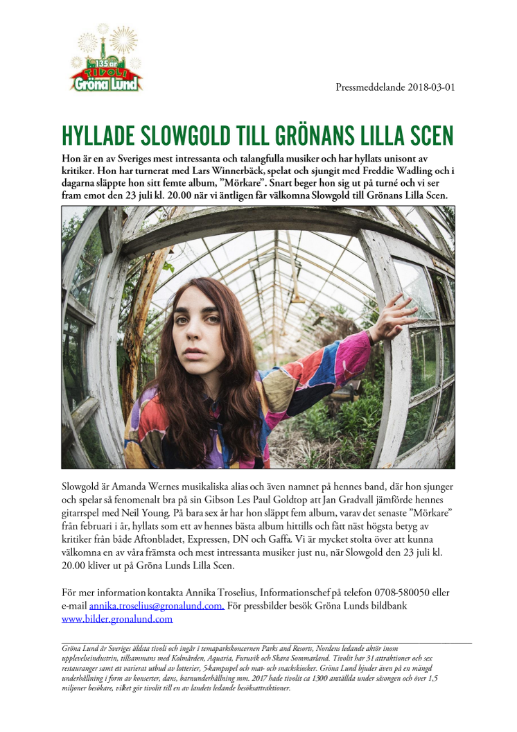 Hon är en av Sveriges mest intressanta och talangfulla musiker och har hyllats unisont av kritiker. Hon har turnerat med Lars Winnerbäck, spelat och sjungit med Freddie Wadling och i dagarna släppte hon sitt femte album, ”Mörkare”. Snart beger hon sig ut på turné och vi ser fram emot den 23 juli kl. 20.00 när vi äntligen får välkomna Slowgold till Grönans Lilla Scen.