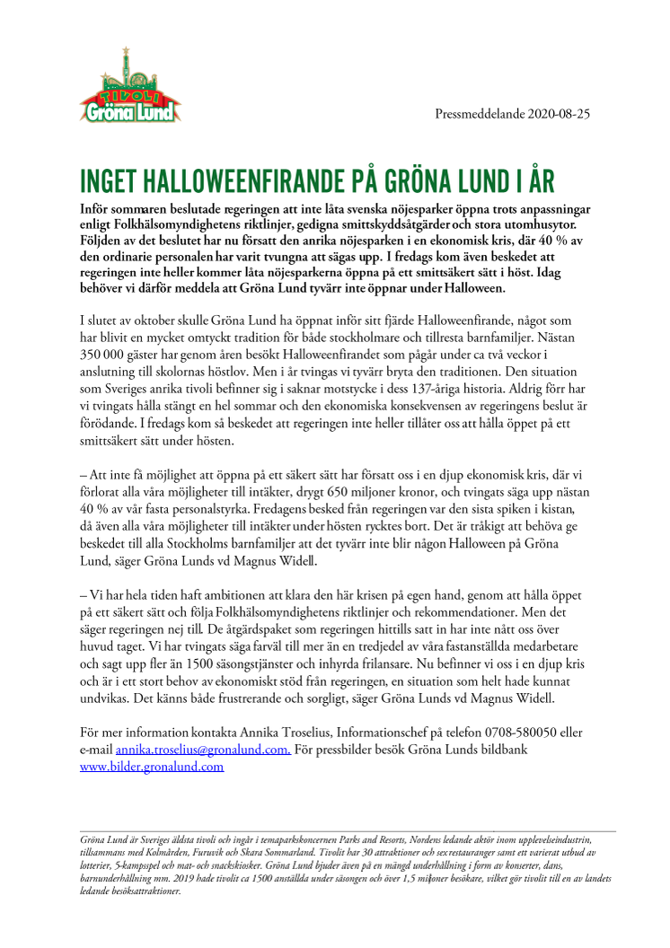 Inför sommaren beslutade regeringen att inte låta svenska nöjesparker öppna trots anpassningar enligt Folkhälsomyndighetens riktlinjer. I fredags kom även beskedet att regeringen inte heller kommer låta nöjesparkerna öppna på ett smittsäkert sätt i höst. Idag behöver vi därför meddela att Gröna Lund tyvärr inte öppnar under Halloween.