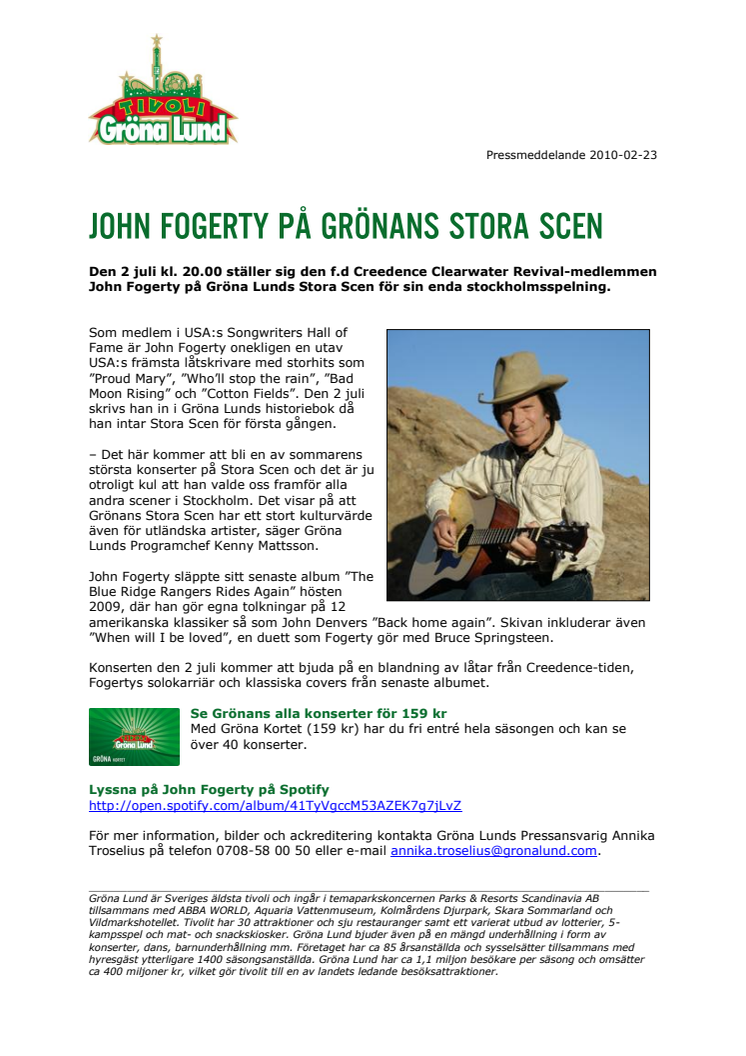 Den 2 juli kl. 20.00 ställer sig den f.d Creedence Clearwater Revival-medlemmen John Fogerty på Gröna Lunds Stora Scen för sin enda stockholmsspelning.