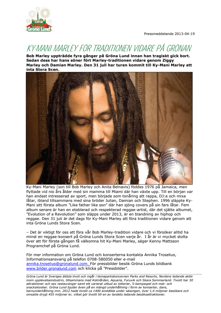 Bob Marley uppträdde fyra gånger på Gröna Lund innan han tragiskt gick bort. Sedan dess har hans söner fört Marley-traditionen vidare genom Ziggy Marley och Damian Marley. Den 31 juli har turen kommit till Ky-Mani Marley att inta Stora Scen.