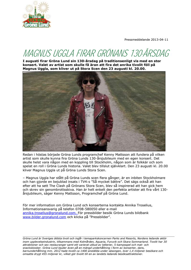 I augusti firar Gröna Lund sin 130-årsdag på traditionsenligt vis med en stor konsert. Valet av artist som skulle få äran att fira det anrika tivolit föll på Magnus Uggla, som kliver ut på Stora Scen den 23 augusti kl. 20.00.