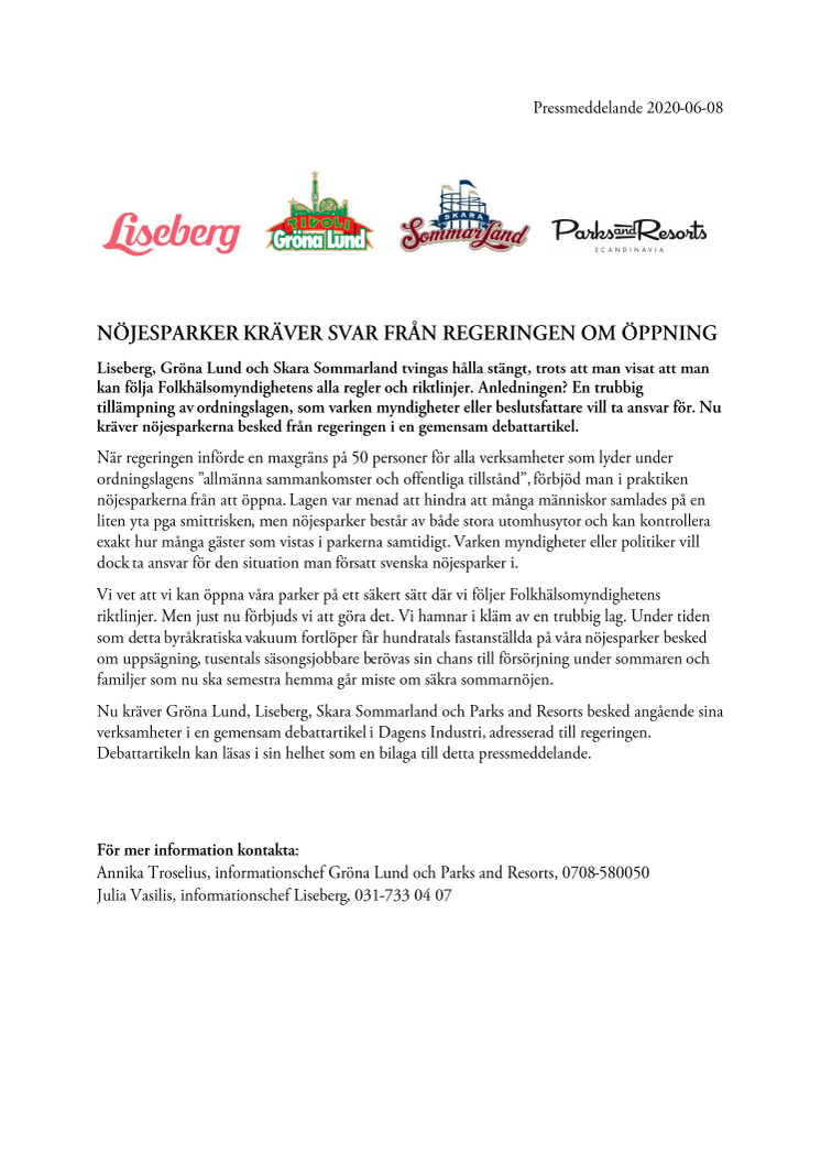 Liseberg, Gröna Lund och Skara Sommarland tvingas hålla stängt, trots att man visat att man kan följa Folkhälsomyndighetens alla regler och riktlinjer. Anledningen? En trubbig tillämpning av ordningslagen, som varken myndigheter eller beslutsfattare vill ta ansvar för. Nu kräver nöjesparkerna besked från regeringen i en gemensam debattartikel.