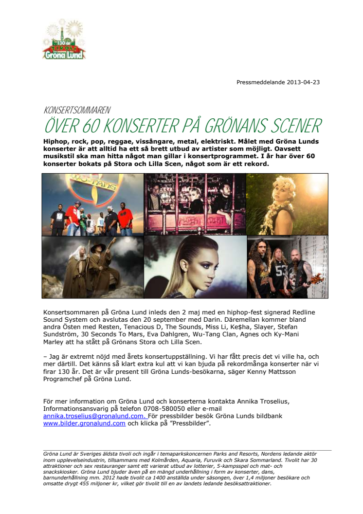 Hiphop, rock, pop, reggae, vissångare, metal, elektriskt. Målet med Gröna Lunds konserter är att alltid ha ett så brett utbud av artister som möjligt. Oavsett musikstil ska man hitta något man gillar i konsertprogrammet. I år har över 60 konserter bokats på Stora och Lilla Scen, något som är ett rekord.