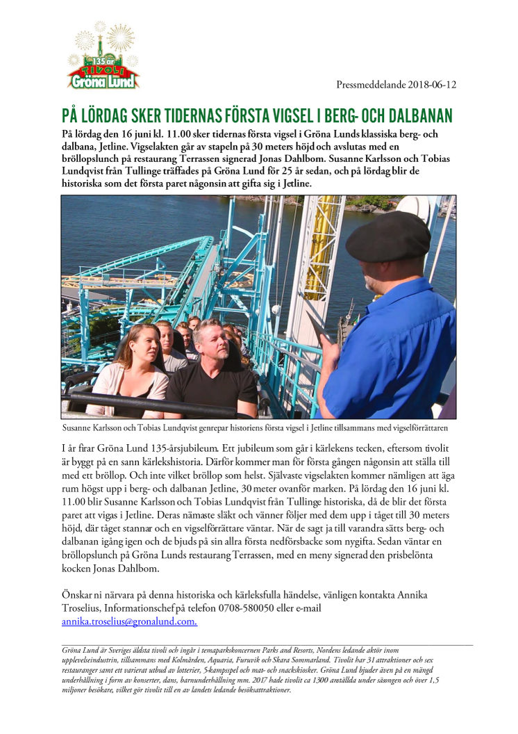 På lördag kl. 11.00 sker tidernas första vigsel i Gröna Lunds berg- och dalbana, Jetline. Vigselakten går av stapeln på 30 meters höjd och avslutas med en bröllopslunch på restaurang Terrassen signerad Jonas Dahlbom. Susanne Karlsson och Tobias Lundqvist från Tullinge träffades på Gröna Lund för 25 år sedan, och på lördag blir de historiska som det första paret någonsin att gifta sig i Jetline.